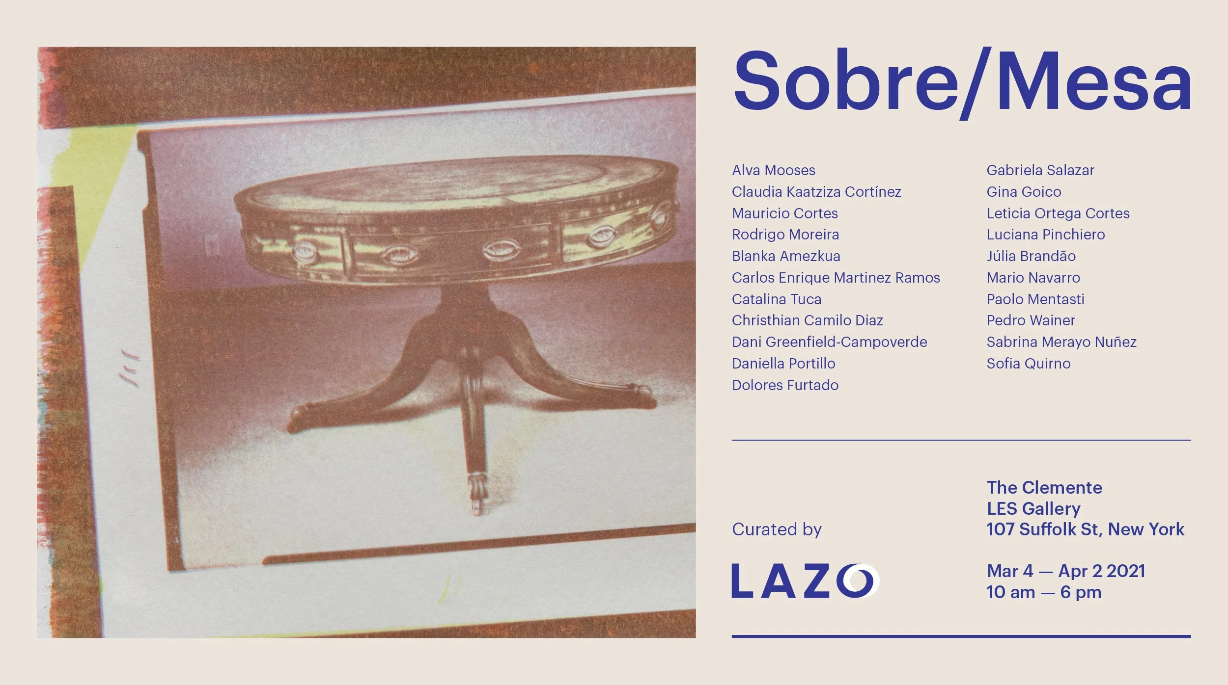 Co-curator of Supported at its Ends—Hanging by its Weight, an exhibition that brings together fourteen artists based throughout the Americas from New York City, to Mexico City, Argentina, and Chile. This exhibition is an inaugural event by LAZO, a platform developed by Alva Mooses & Claudia Cortinez as a resource and archive for contemporary artists of Latin American and Caribbean descent.